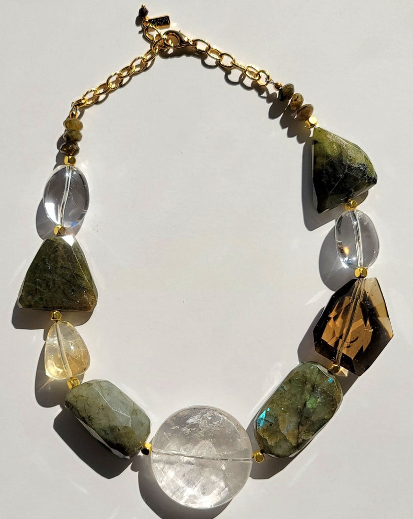 Adorn your neck with this gorgeous statement necklace, featuring faceted gemstones of clear quartz, labradorite, smoky quartz, and citrine, all with dazzling gold-plated accents. Length is adjustable from 18-20”.