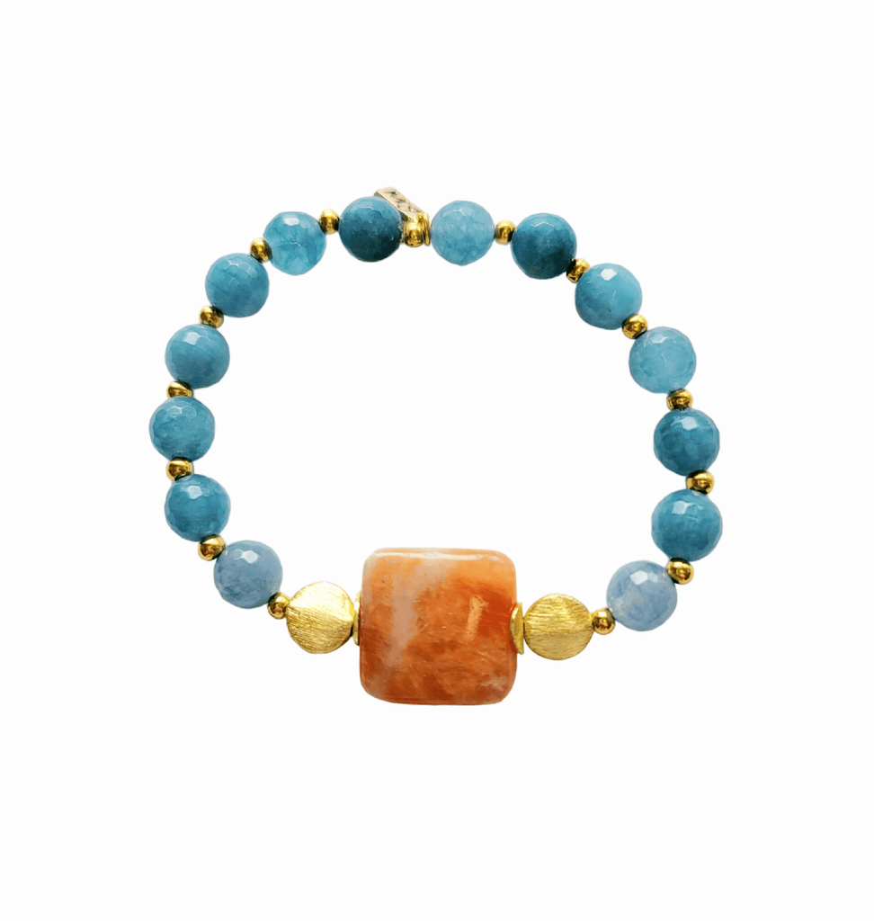 Beautiful blue faceted quartz with orange agate with gold-plated accents.  Stretch style.