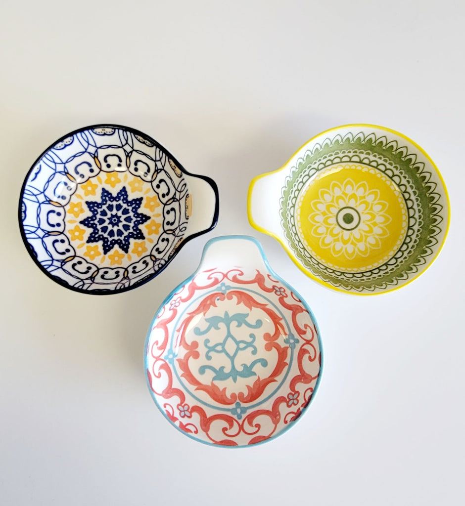 Set of 3 ceramic dipping bowls, each with a 4-inch diameter, hand-painted and crafted in Egypt. Great for serving chocolates, sweets, nuts, and more - best to hand-wash.