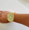 plated cuff bracelet with navy blue enamel design. 2.25" tall, 7.5" long.