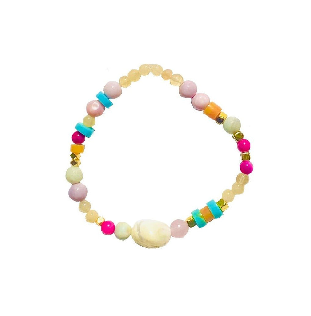 Beautiful multicolored stones and gold accents with mother of pearl. Perfect for summer. Stretchy.