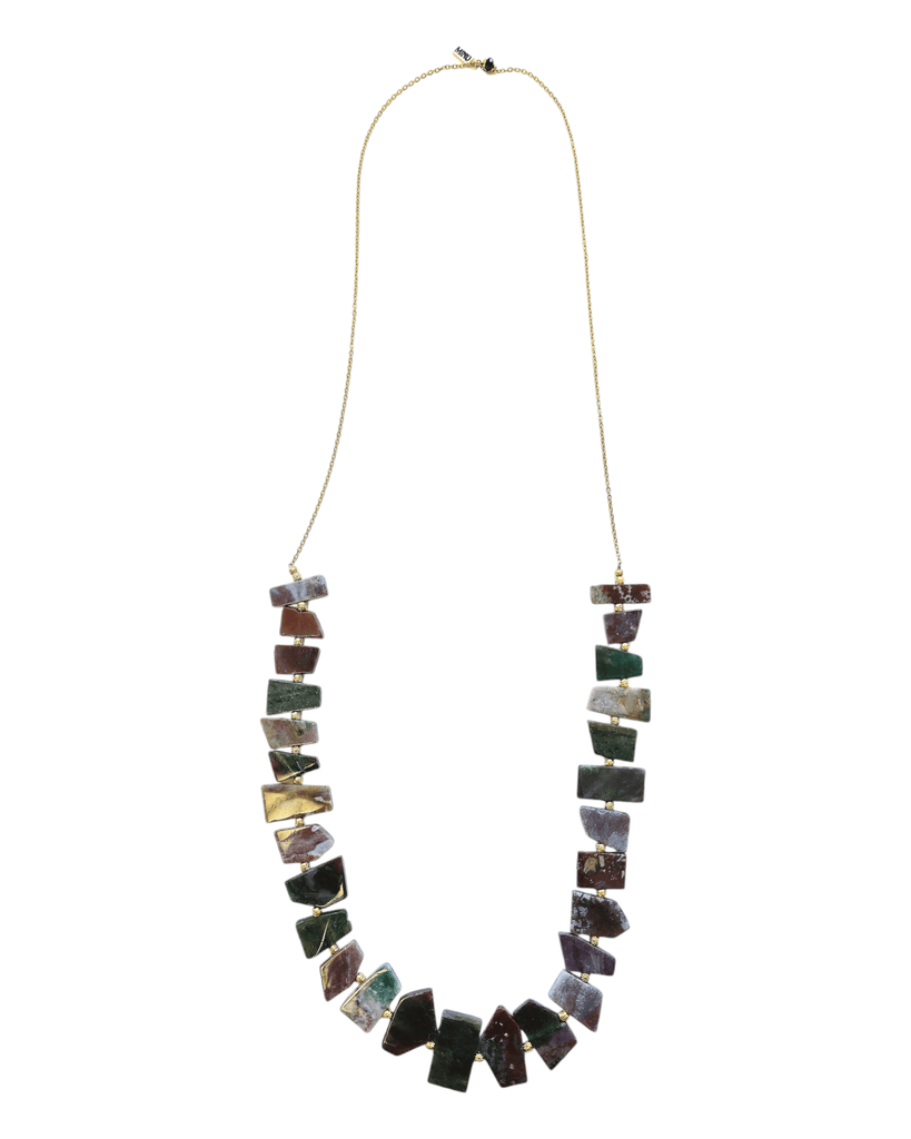 Light and stylish. Multicolored agate with gold-plated accents and chain. 28 inches, no clasp.