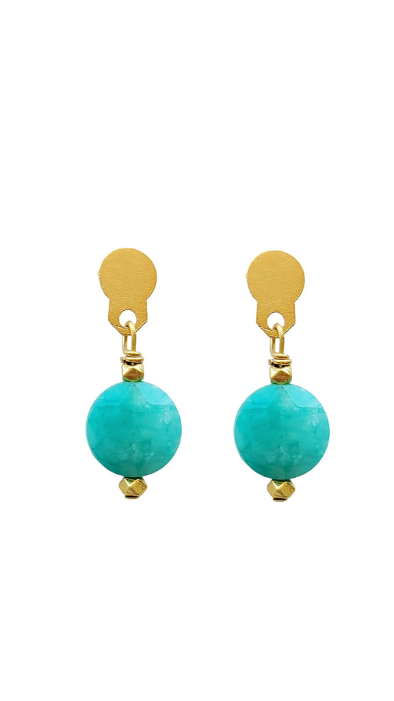 Such a beauty! Beautiful faceted amazonite coin stones with a blend of green-blue color on 18kt gold-plated post. 1.5 inches long, pierced.