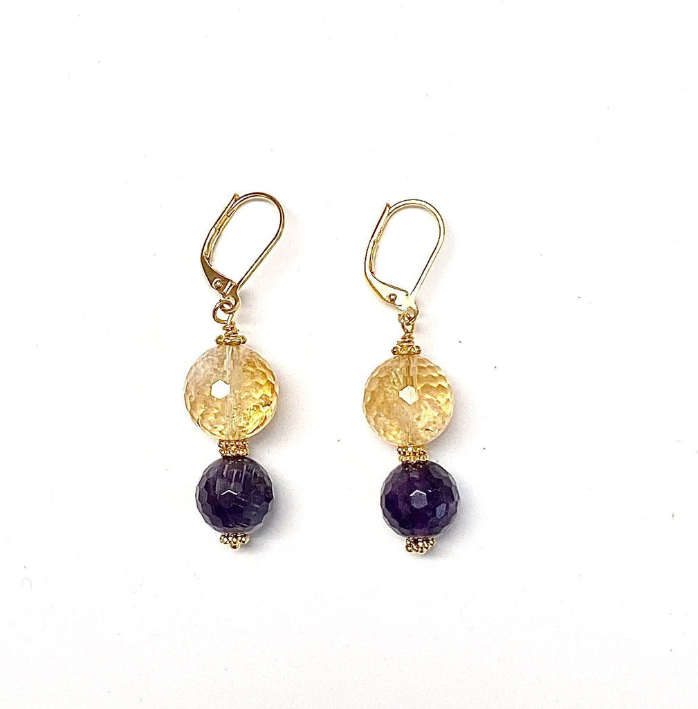 Elevate your style with these radiant gold-plated earrings featuring stunning faceted amethyst and citrine gems. Measuring 1.5 inches in length, these earrings are perfect for piercings.