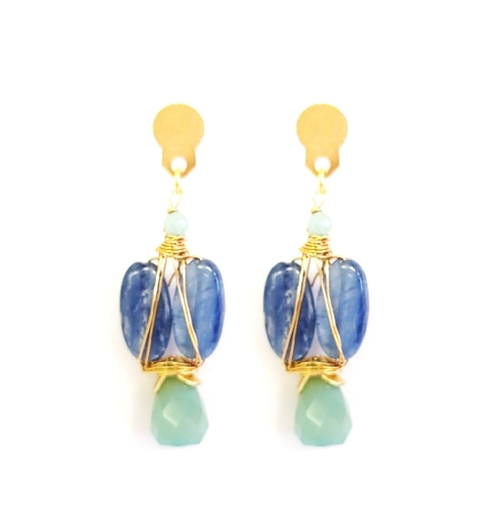 Beautiful statement earrings. Made of kyanite with blue chalcedony and gold-plated accents. 1.50” long. Pierced, post.