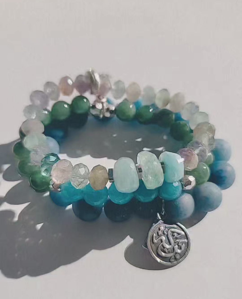 The blue aventurine bracelet has .925 silver Arabic calligraphy pendant that says Baraka which means "Good Wishes".