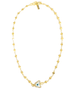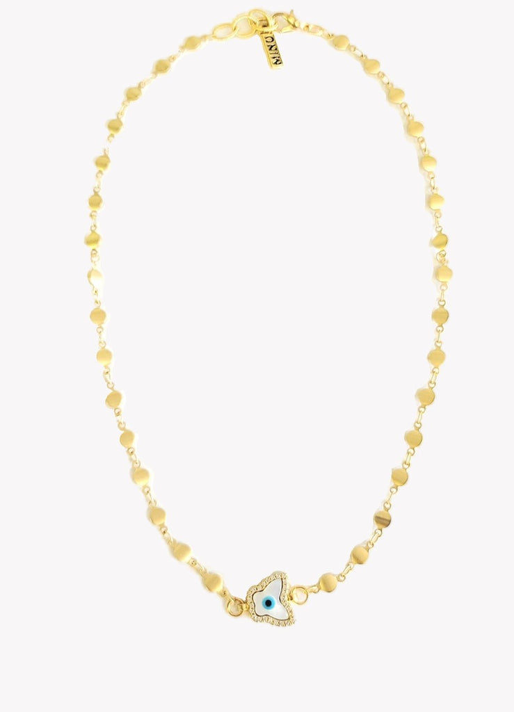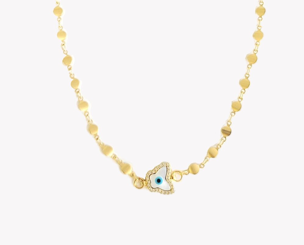 Great for layering. Beautiful gold plated deco chain with butterfly mother-of-pearl eye pendant. 16” long, adjustable.