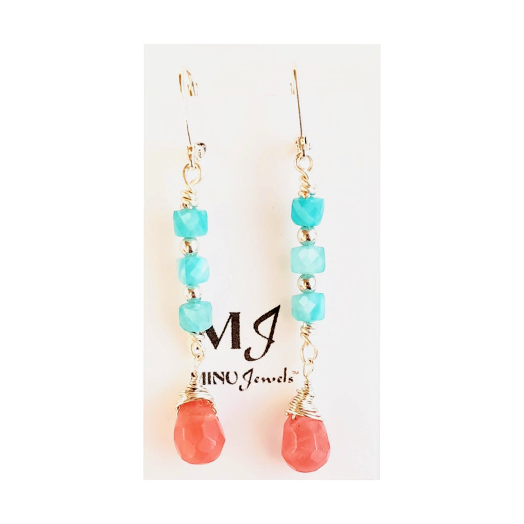 Beautiful faceted amazonite earrings with cherry quartz drops with silver plate.  Very lightweight.  2 inches long, pierced ears, clasp.