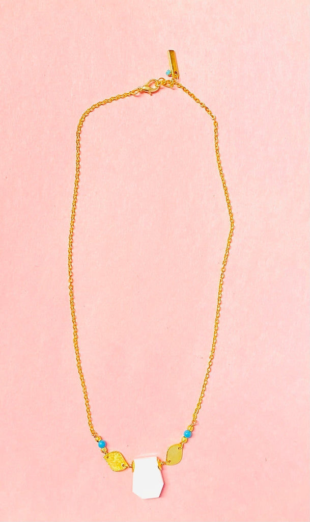 Beautiful and gold. Made of gold plated with turquoise and white agate. 16-18 inches, adjustable.