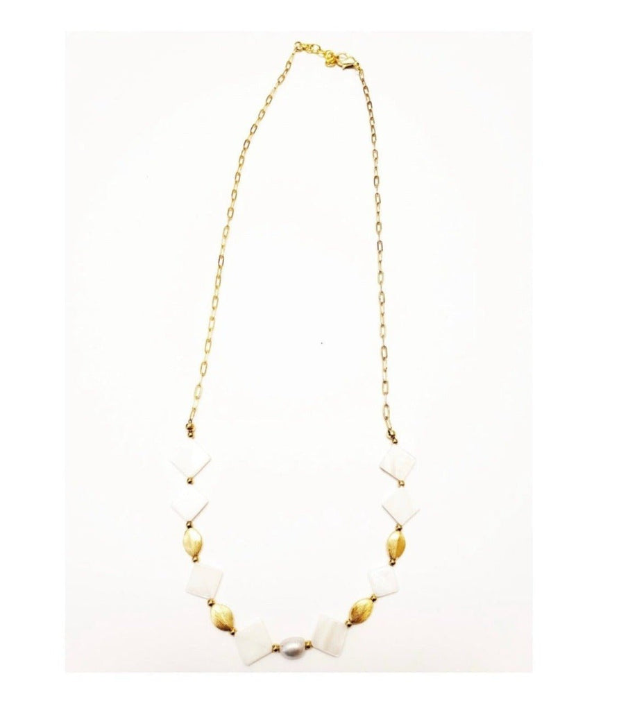 Perfect for layering. Made of beautiful 18kt gold plate accents, pearls, and mother-of-pearl. 16-18” long, adjustable.