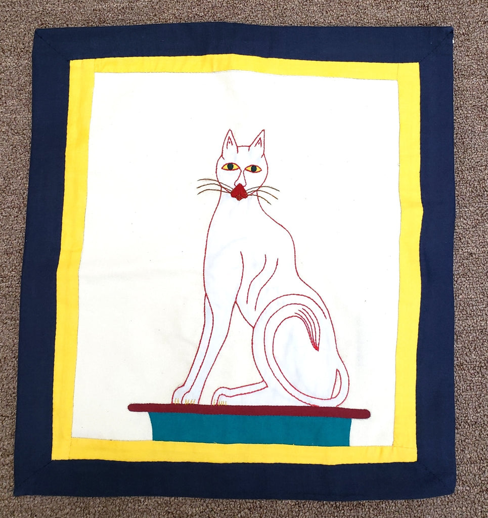 Just love these throw pillow cases! Made of Egyptian cotton with beautiful Egyptian cat design.  Zipper opening on backside.  Machine washable delicate cold. Air dry recommended.  Each case is 17 inches x 20 inches. Pillow insert not included. Handmade. Two colors available.