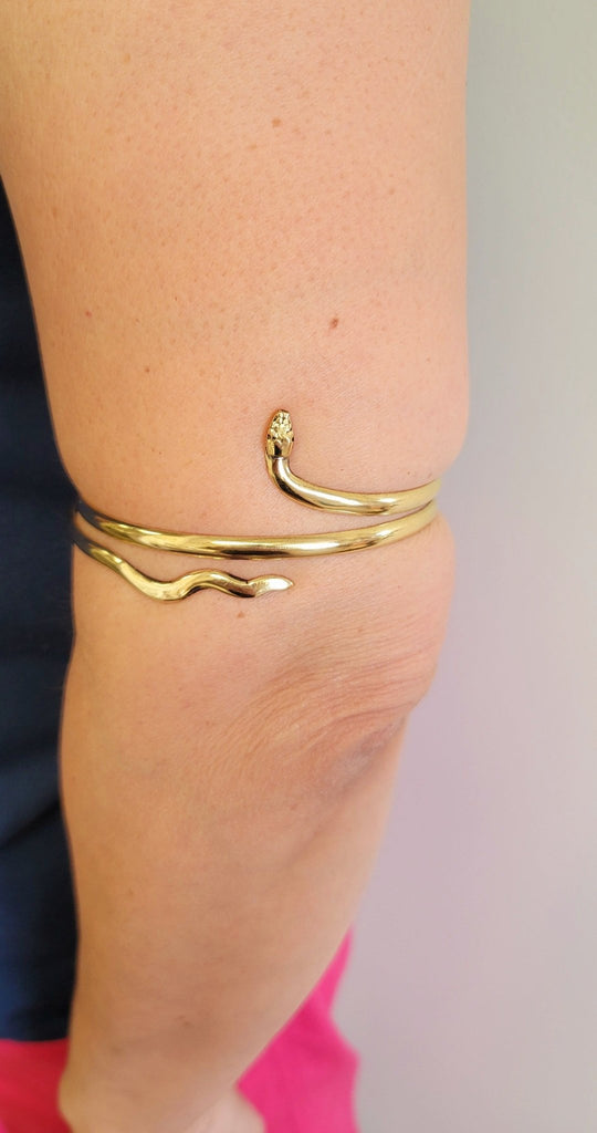 Experience the opulence and luxury of Egypt with this stunning brass gold plated three layer arm cuff. Its adjustable design features a captivating Egyptian Snake motif, handcrafted in Egypt. Elevate your style and add a touch of exotic beauty to your wardrobe with this must-have arm cuff.