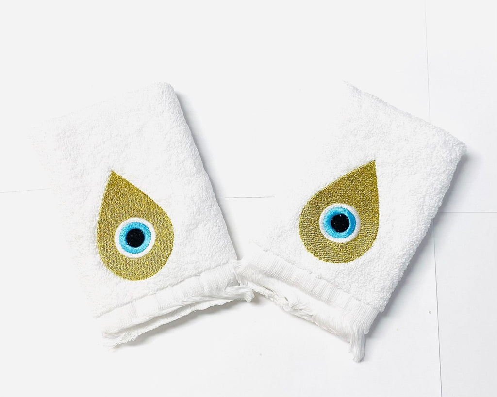 Two beautiful beige colored hand towels with evil eye. Made of 100% Egyptian cotton. 13 inches x 13 inches.