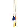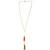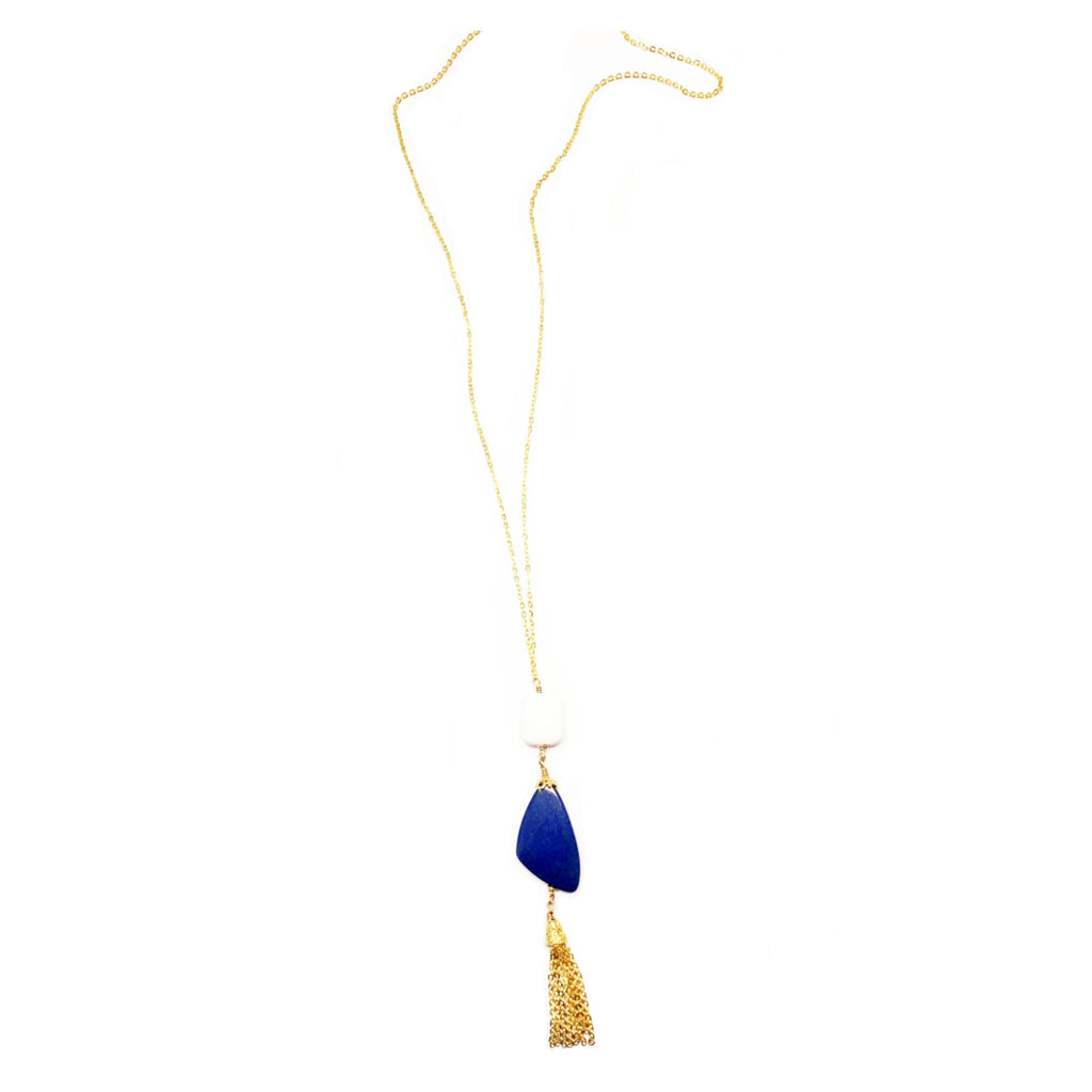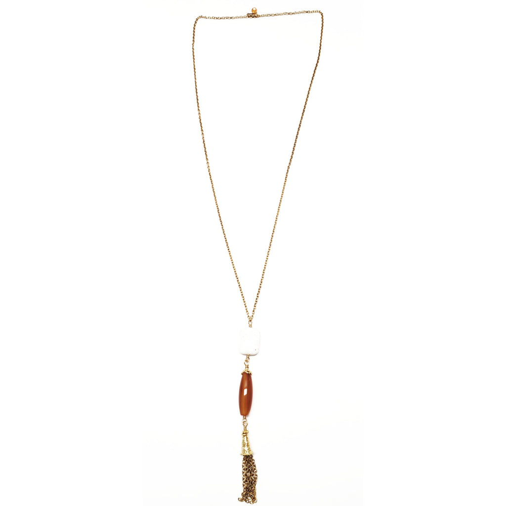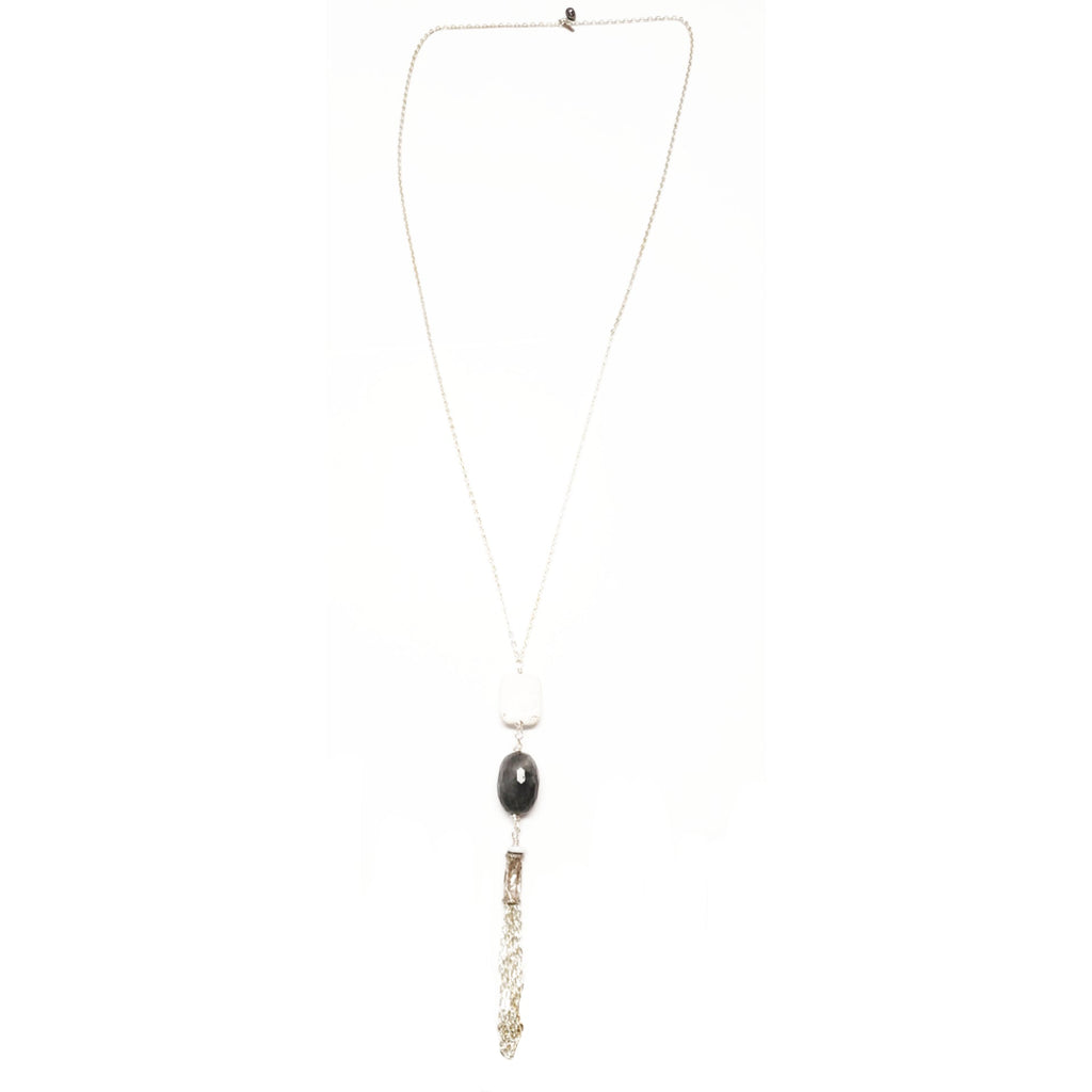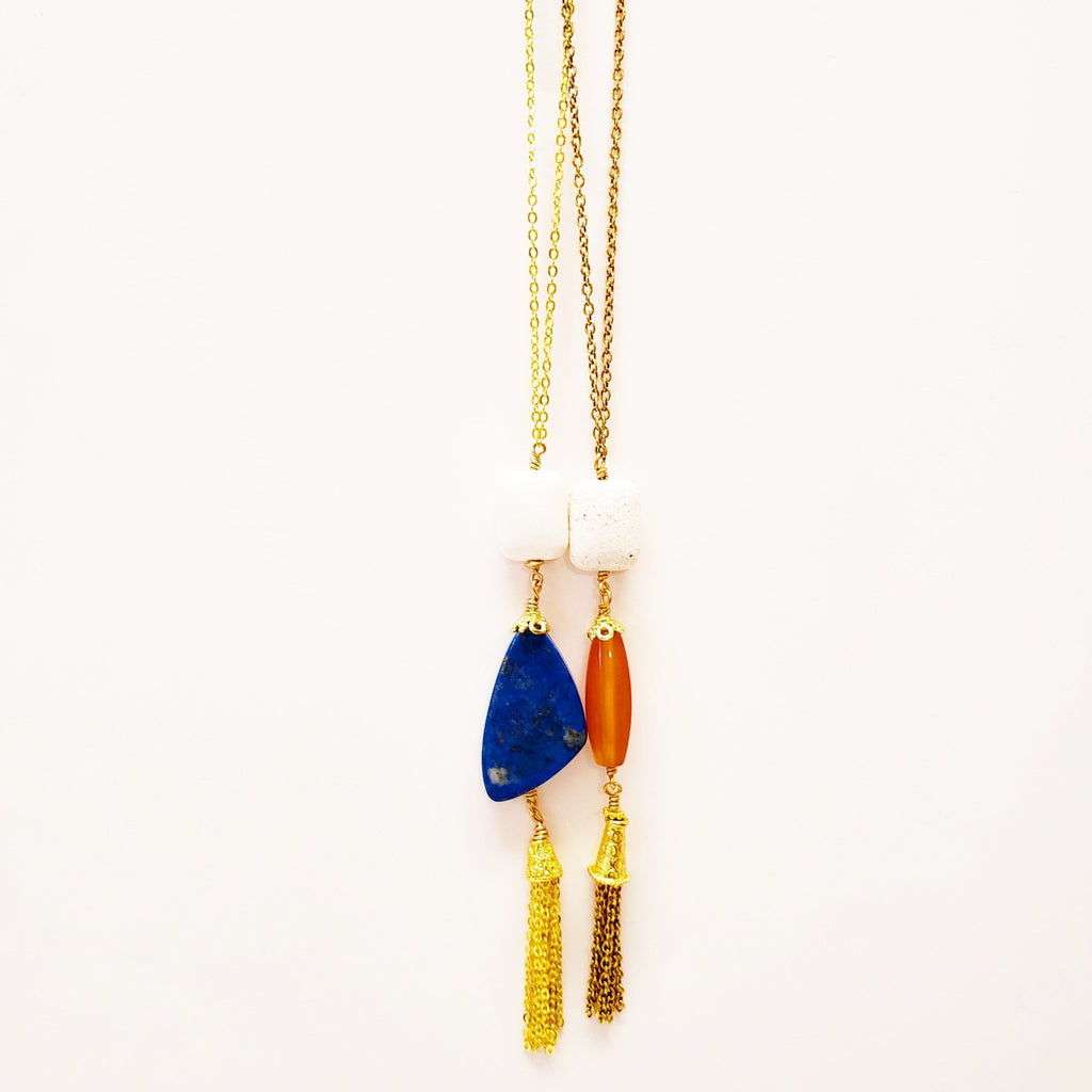 A necklace that is so stylish. Made of silver or gold finish. Red orange agate or lapis, white, and gold accents or gray quartz, white and silver ascents. Plated materials. 24” long, no clasp.