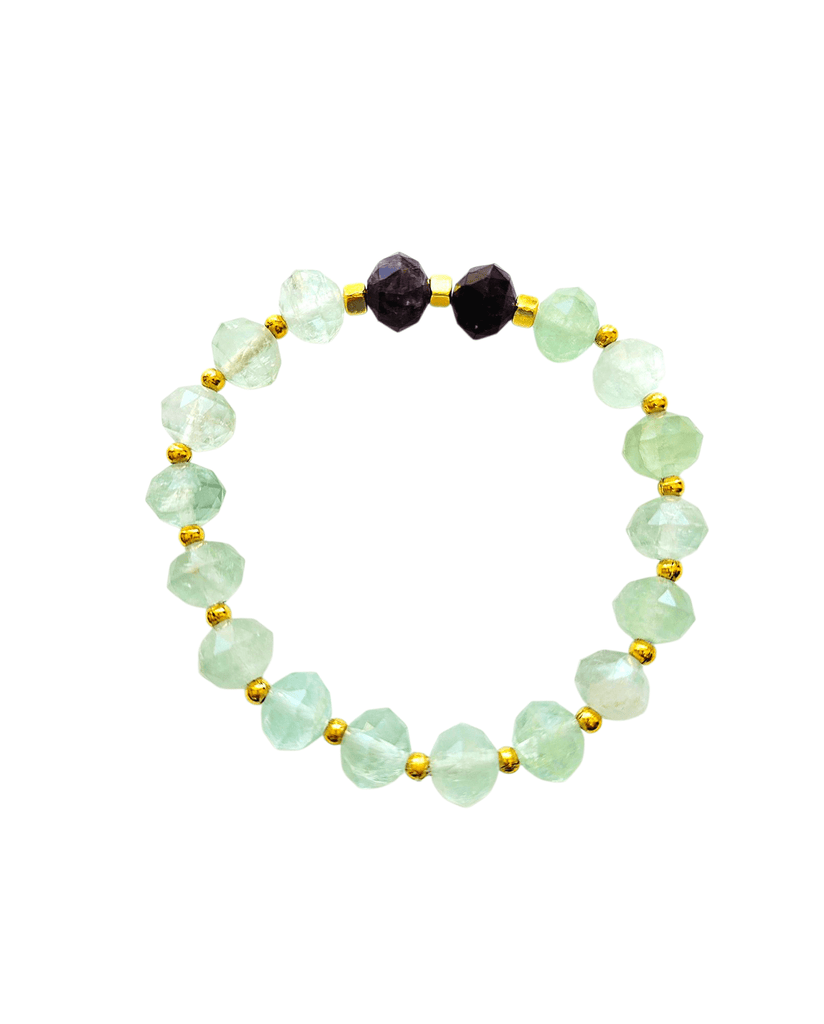 This stunning bracelet features all faceted flourite stones with gold-plated accents. It measures 7.5 inches and has a stretch style.