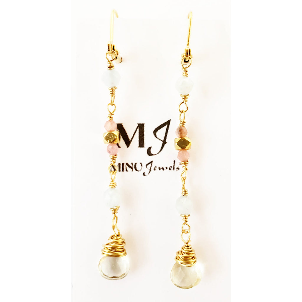 Beautiful faceted aquamarine, pink jade earrings with lemon topaz drops with gold plate. Very lightweight. 2 inches long, pierced ears, clasp.