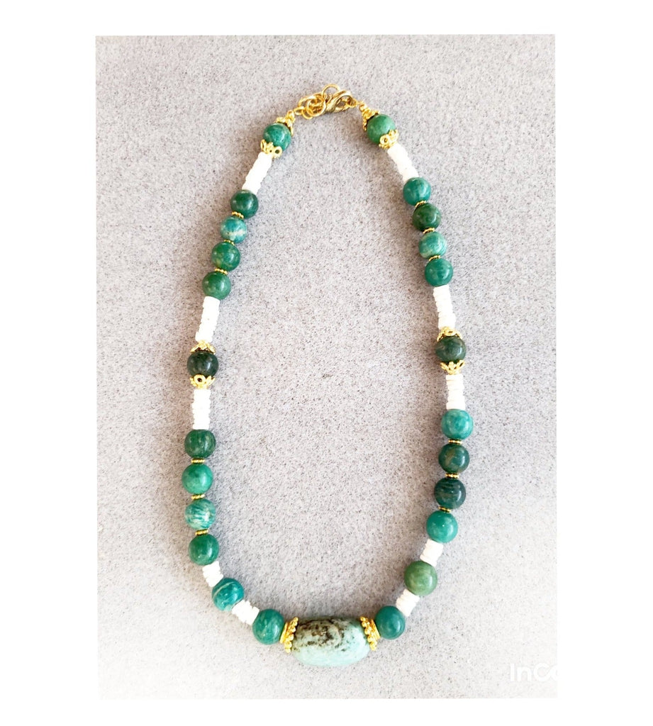 Perfect for layering. Made of beautiful amazonite and shells with gold plate chain. 16-18” long, adjustable.