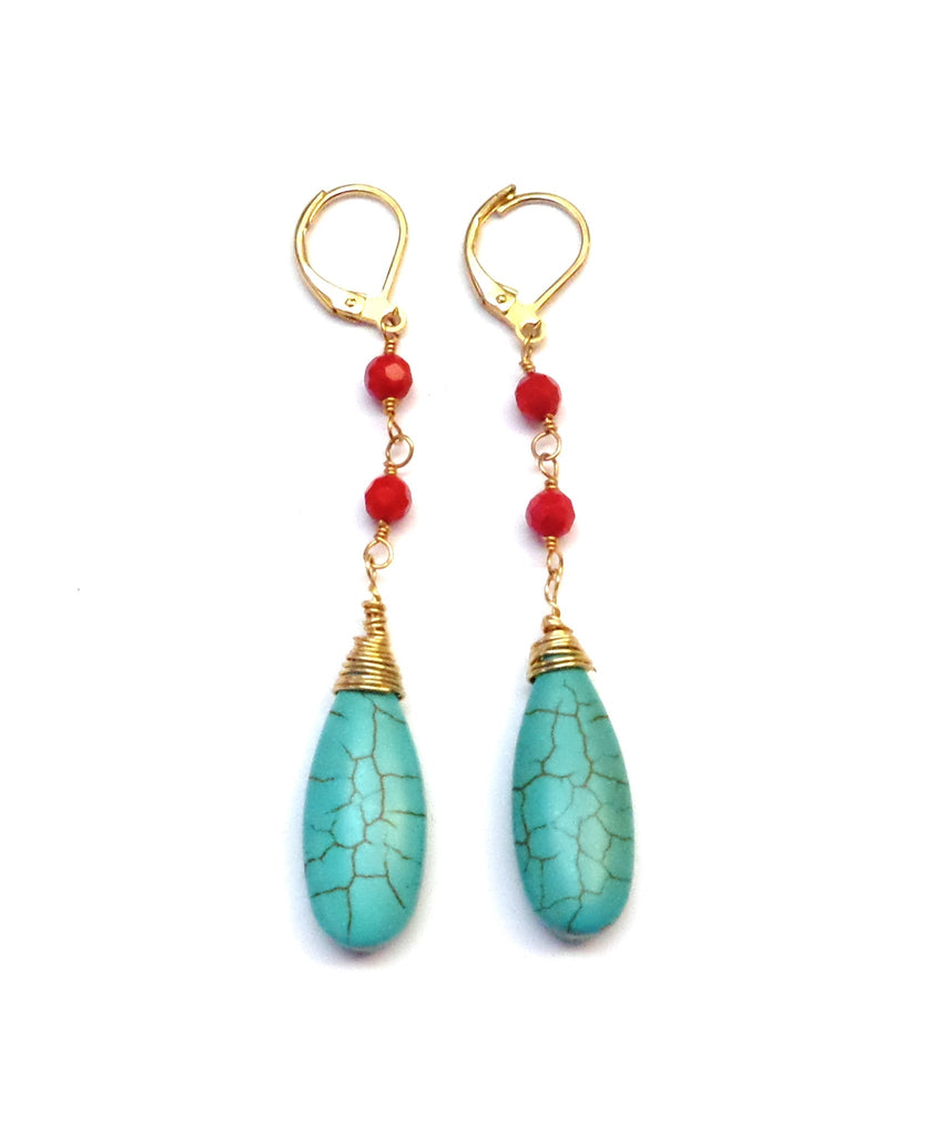 Beautiful faceted red stone and turquoise magnesite. 2.5 inches long on ear clasp. Pierced.