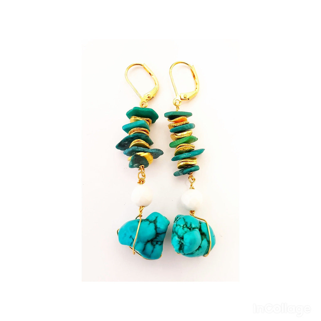 Simple and lightweight. Beautiful gold earrings with turquoise, white agate. and gold-plated accents. 1.75 inches long,  pierced.