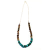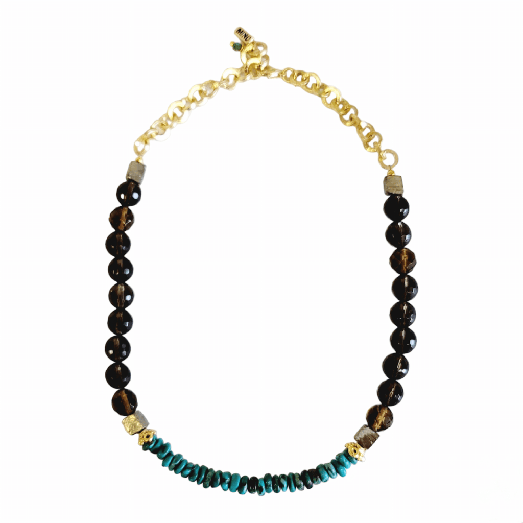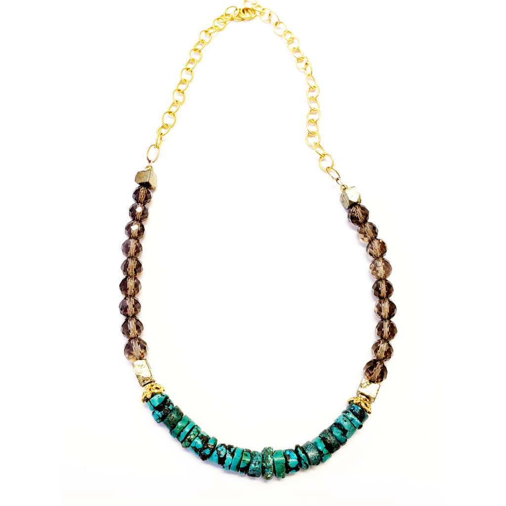 Beautiful simple necklace with a rich look for Fall. Made of smoky quartz, turquoise, pyrite, silver or gold. 16” long and adjustable.