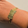 Brass gold plated semi-cuff with side closure.  Diameter is 2.2 inches, width is .25 inches. Very lightweight. Egyptian god Osirus design. Made in Egypt.