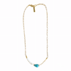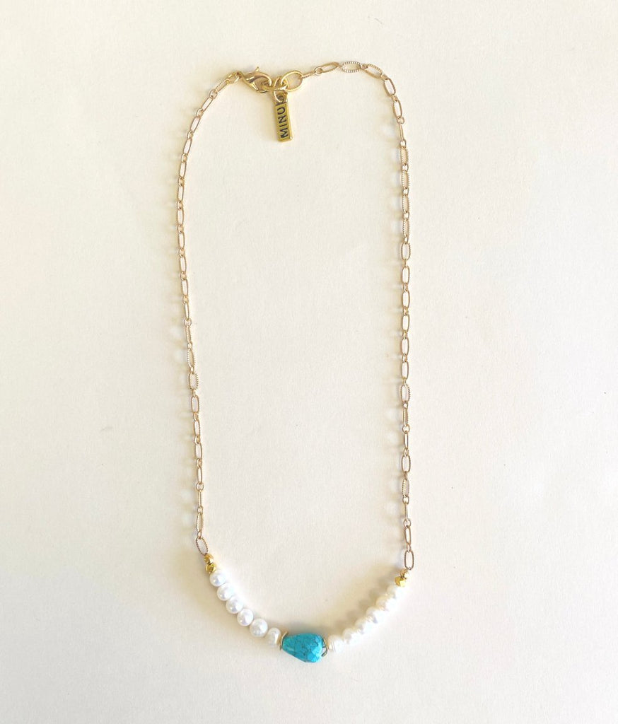 Made of beautiful turquoise and white pearls with gold accents. 16-18” long, adjustable.