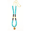 Statement and stylish. Made of gold plated accents with turquoise, black onyx, jade, and chalcedony. Long 24 inches, no clasp.