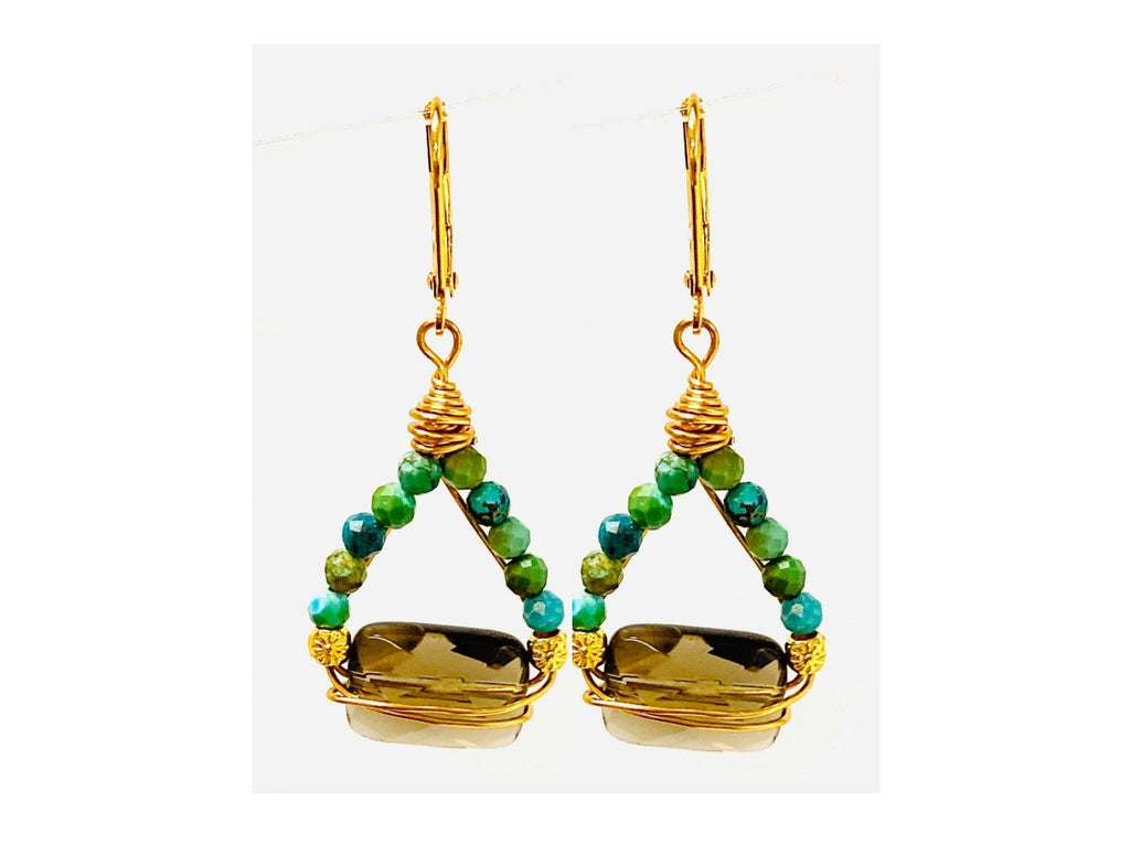Smoky quartz paired with turquoise. Gold plated, Length: 1.25 inches. Pierced.