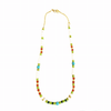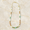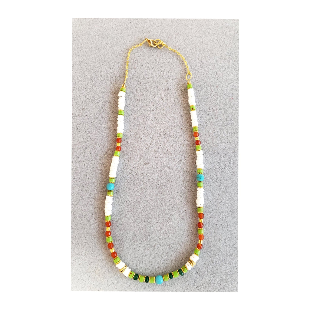 Perfect for layering. Made of beautiful carnelion, gaspite, turquoise and shells with gold plate chain. 16-18” long, adjustable.