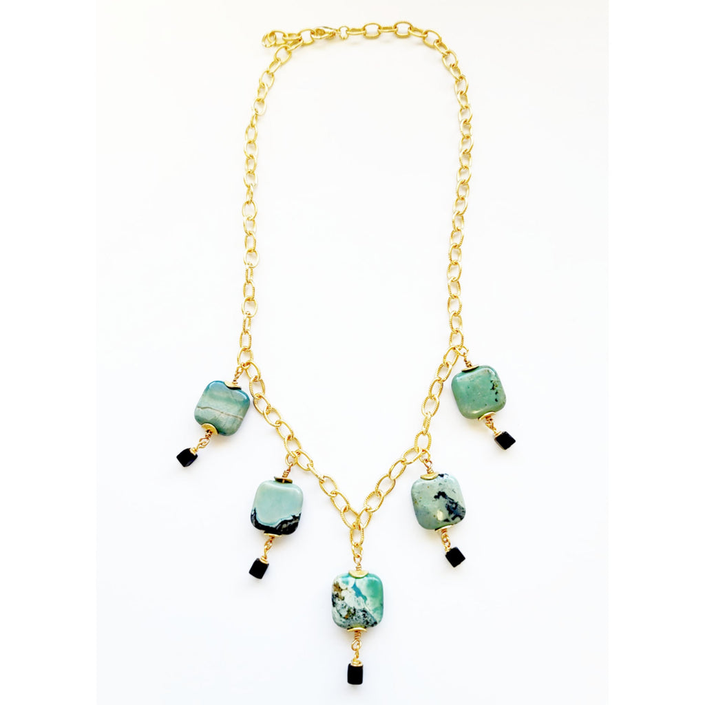 Made of African turquoise and lapis with gold accents. 16-18” long, adjustable.