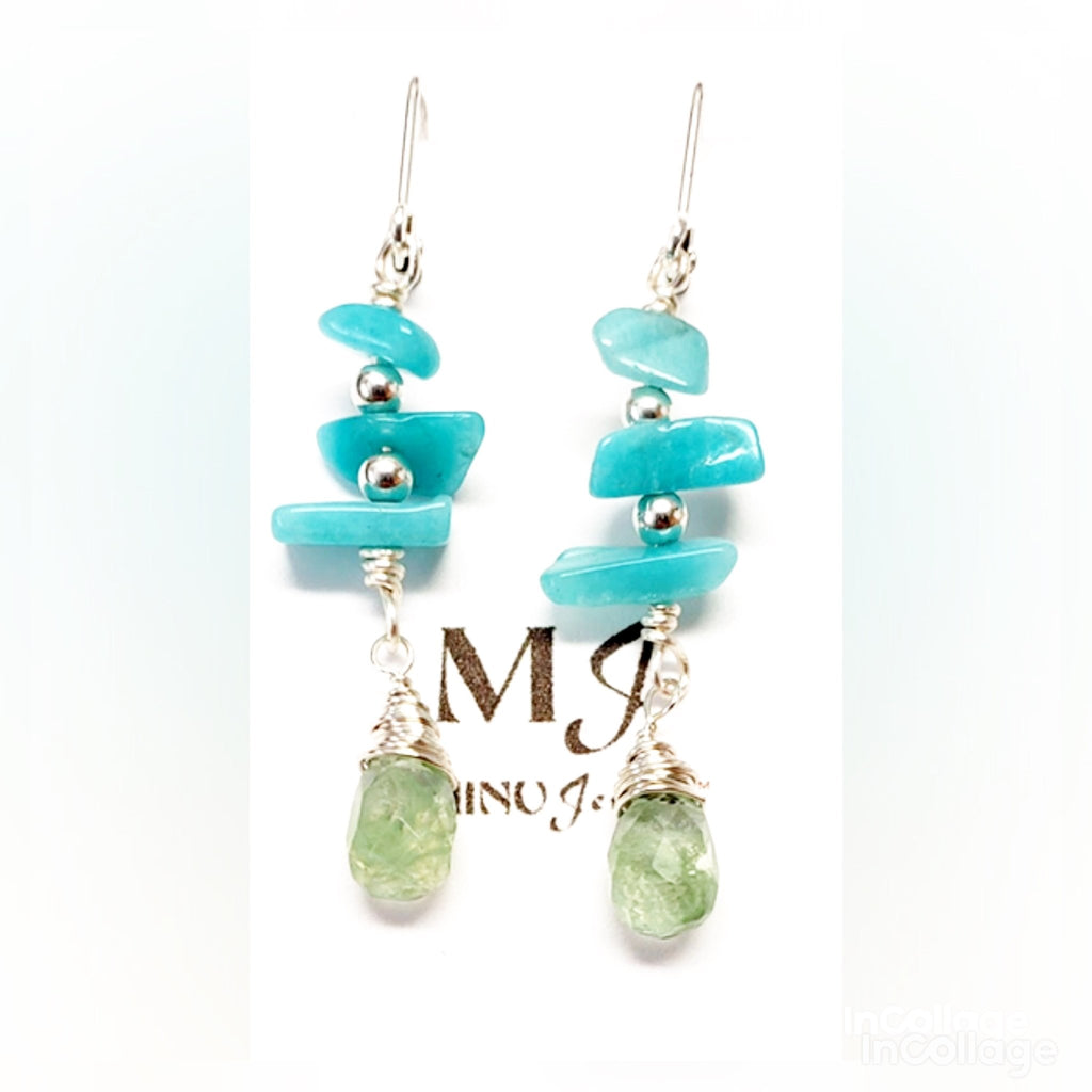 Beautiful amazonite earrings with blue quartz drops with silver plate. Very lightweight. 2 inches long, pierced ears, clasp.