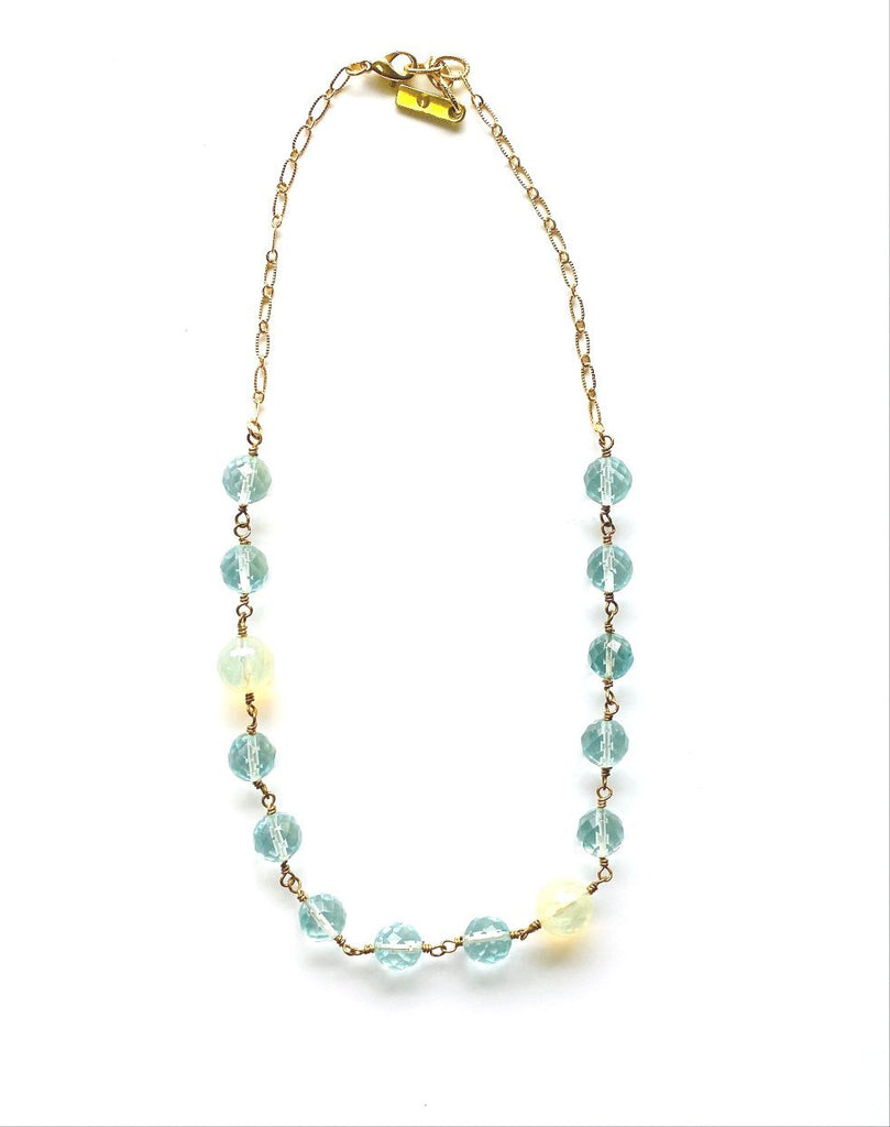 Beautiful long style necklace. Made of of faceted blue quartz and pineapple quartz on gold chain. 16” long. Clasp.