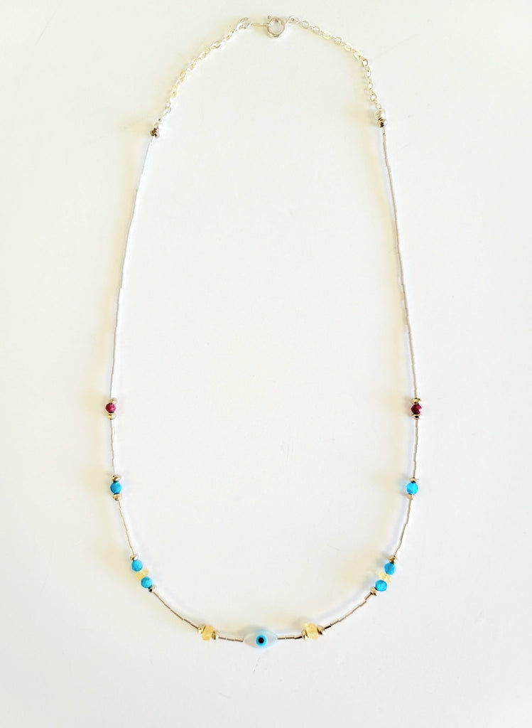 Silver necklace features eye pendant with faceted yellow onyx, apatite, ruby, and pyrite. Measures 16-17" long with a spring clasp. .925 silver.