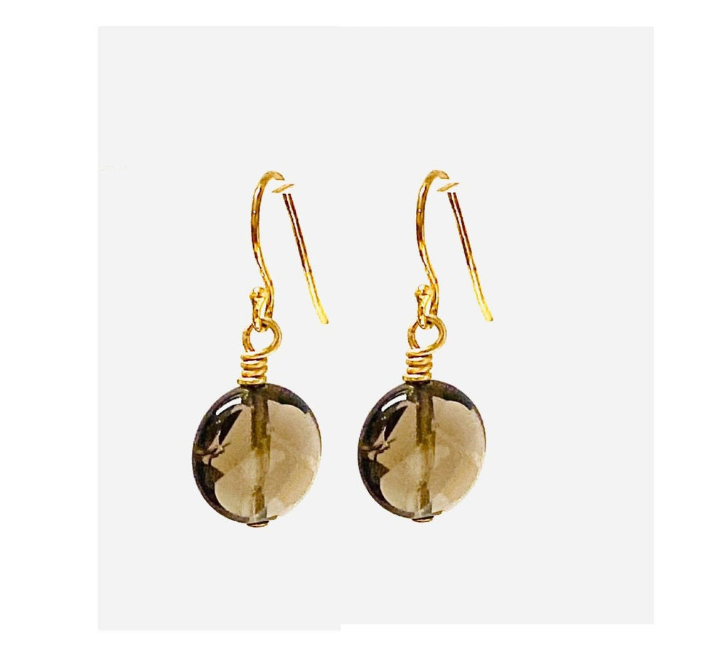 A great pair of earrings for everyday. Made of smoky quartz. Gold plated. Hangs 1.5 in.