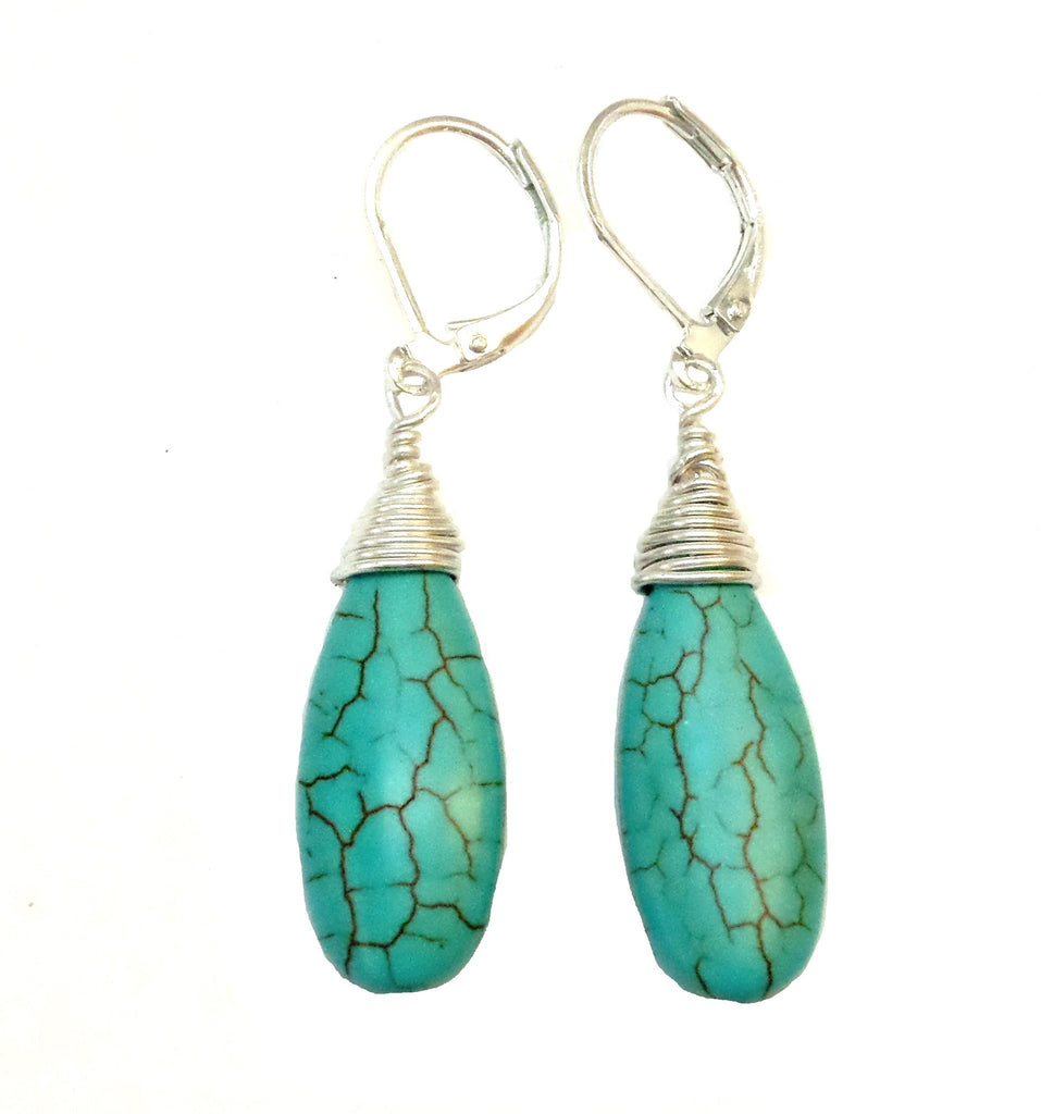 Cute simple earrings made of turquoise magnesite with gold-plated or silver-plated accents. Clasp, pierced. 1.75 inches long.