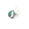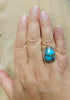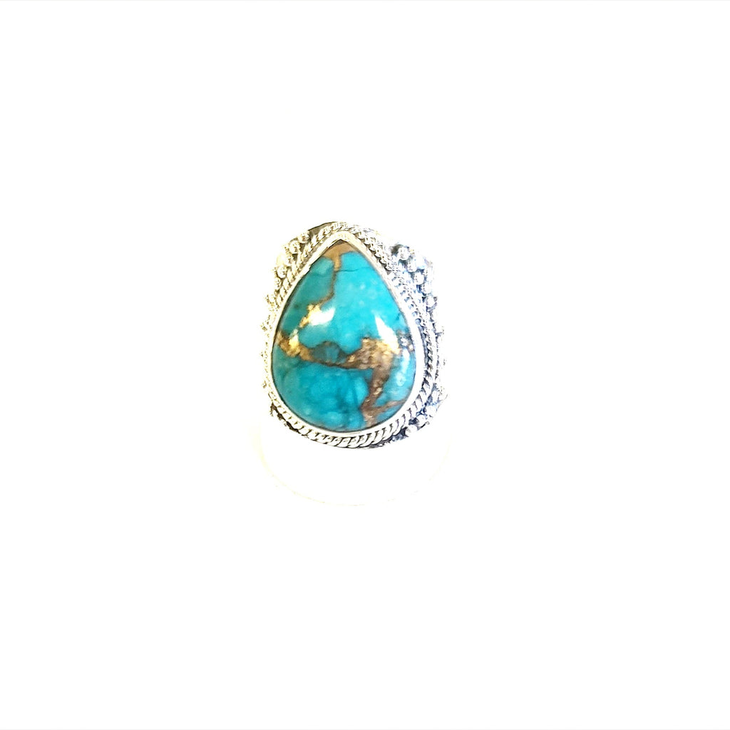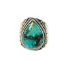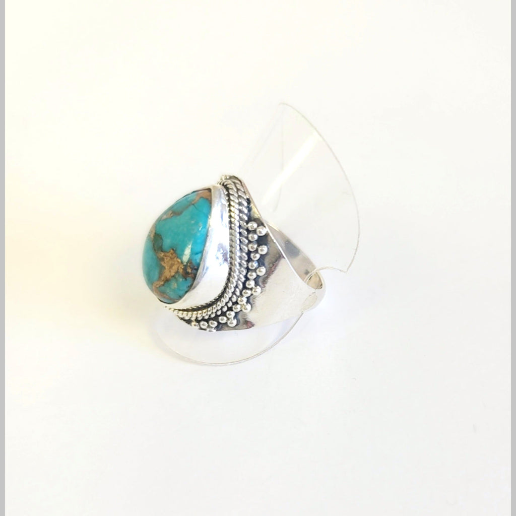 Beautiful blue turquoise stone set in ornate .925 silver. Turquoise is .75 inch x .50 inch, pear shaped. Size 8. Only 1 available.