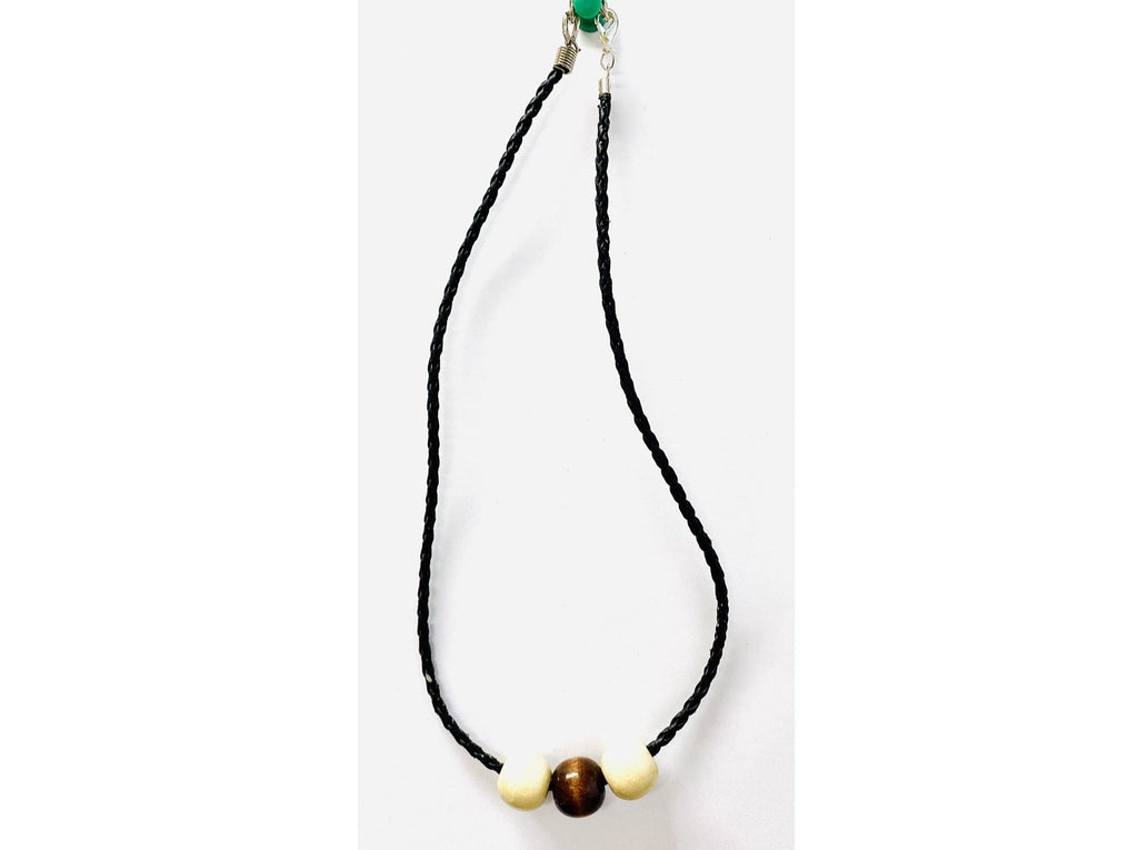 Made of beautiful black leather with white and brown wood. Silver clasp. 18 inches long.